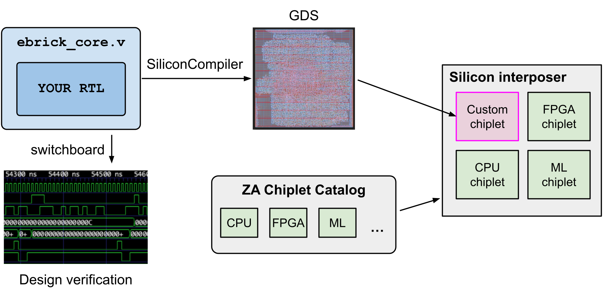 EBRICKs are chiplets with a standard interface and standard sizes, making it possible to mix and match them on a general-purpose silicon interposer. Zero ASIC is currently developing a catalog of standard EBRICKs, including a RISC-V CPU, a machine learning accelerator, and an FPGA. By combining these standard chiplets with a custom EBRICK containing the "secret sauce" for an application, high-performance hardware products can be developed in a cost- and time-efficient manner.