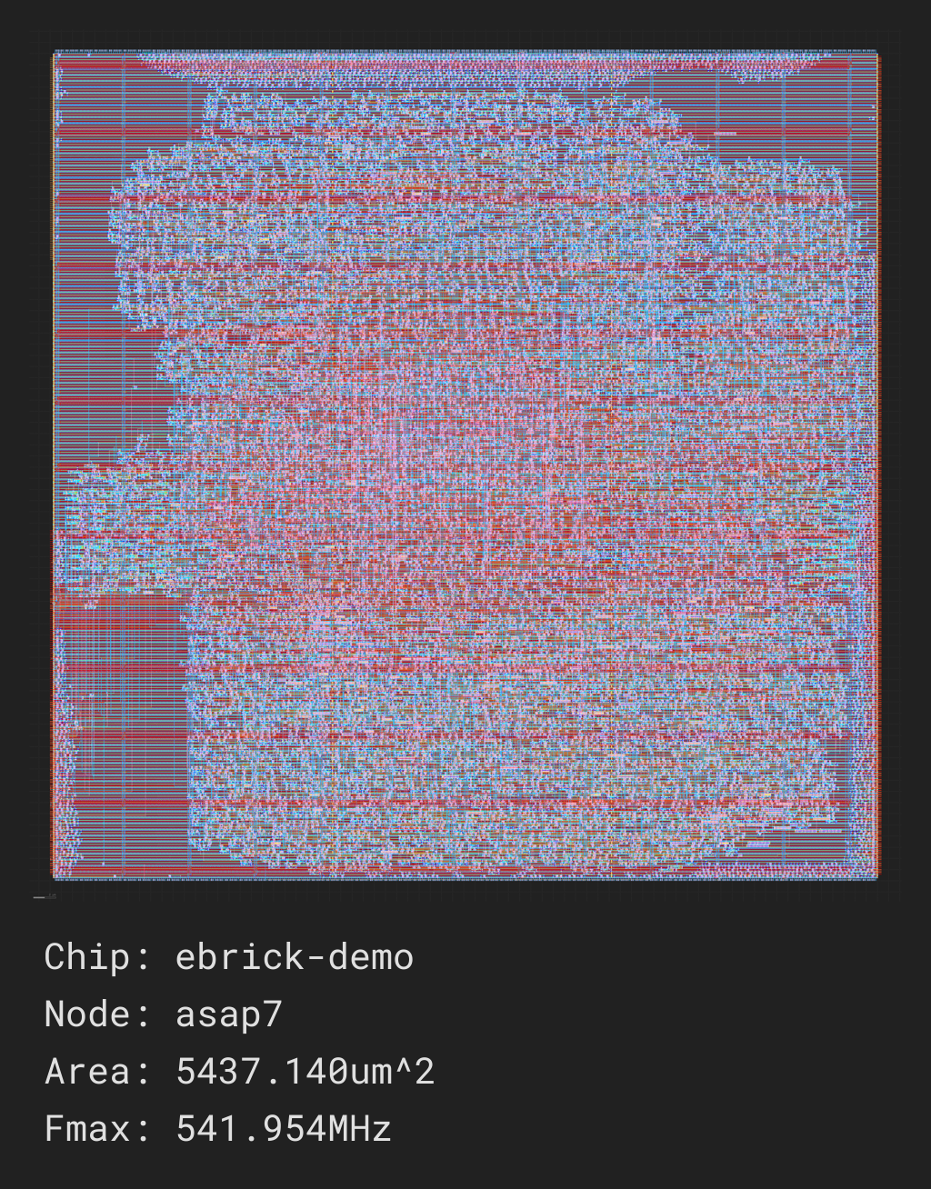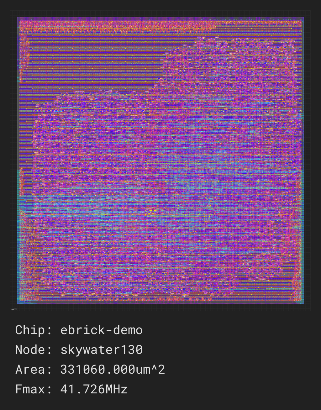 In the demo, we show how our tools switchboard and SiliconCompiler make it easy to verify a custom EBRICK design and generate a physical implementation. The intent is that the demo repository may be used as a template for building custom EBRICKs, where the demo logic is replaced with a user's custom logic.