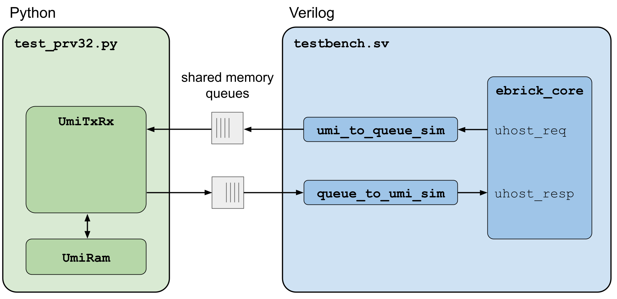 Once ebrick_core integration is completed, the design can be tested using switchboard. On the Verilog side of the test setup, the custom ebrick_core module is connected to modules that convey its UMI transactions to/from shared memory queues. On the Python side, a UmiTxRx object sends UMI packets to and receives UMI packets from these shared memory queues. A processing loop in Python inspects incoming packets and forwards memory transactions to an instance of UmiRam, a software model of UMI memory.